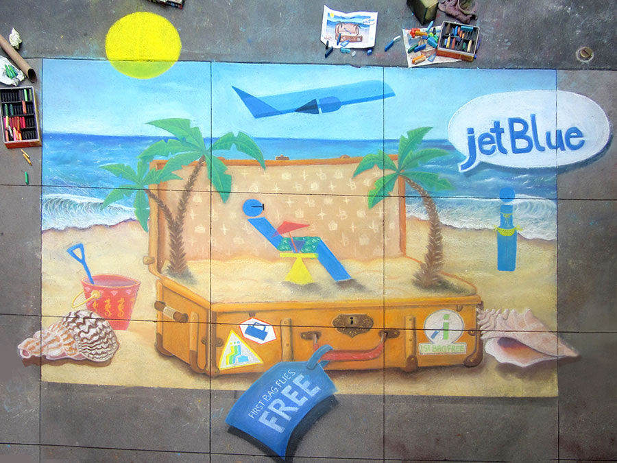 My team and I were hired by JetBlue Airways to create a large chalk mural promoting their new First Bag Free program. The artwork visually highlighted the excitement of the program and engaged viewers in a fun, interactive way.
